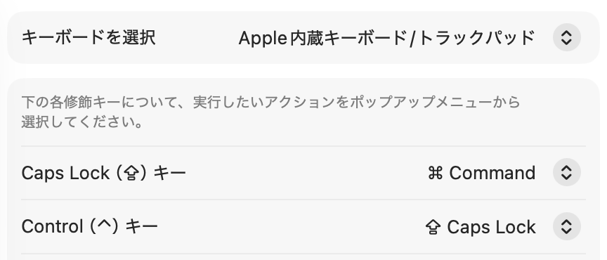 これで、キーボードの左端(WindowsのCtrlがあった位置)にあるキーが「Command」として機能するようになります。つまり、「いつもの小指の位置」でコピペができるようになるのです。