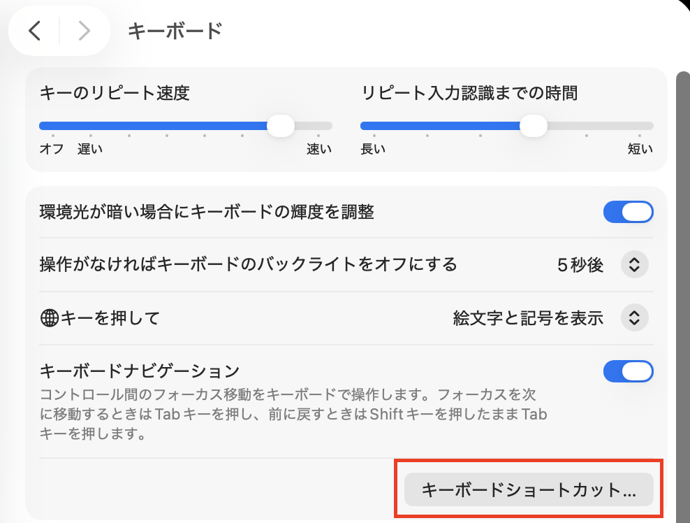左メニューの**「キーボード」を選択し、右側に表示される「キーボードショートカット…」**ボタンをクリックします。
