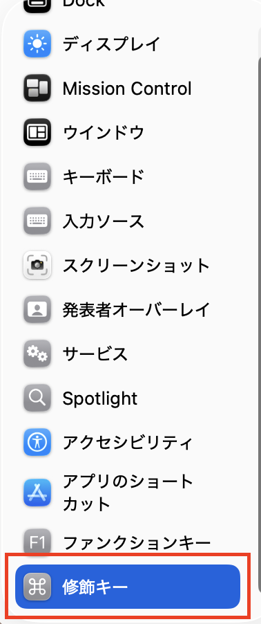 左側のリストから**「修飾キー」**を選択します。ここで、各キーの役割を自由に変更できます。